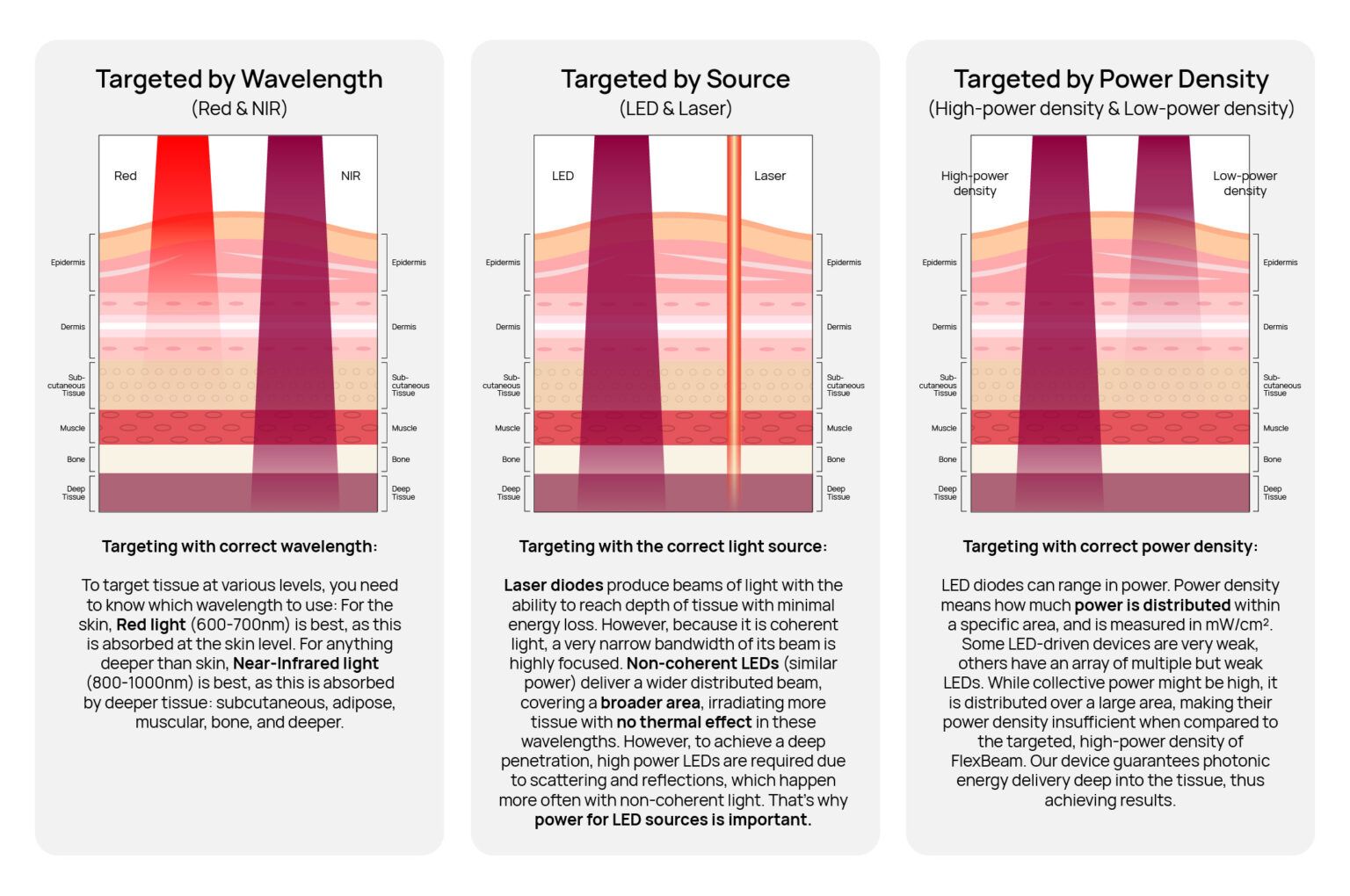 Let’s explain this in more detail. Power output is the energy emitted by a device. Higher power output means the potential for more energy. We equipped FlexBeam with 3-5x more power than any other portable device on the market. However, that alone doesn’t have to mean it’s better.