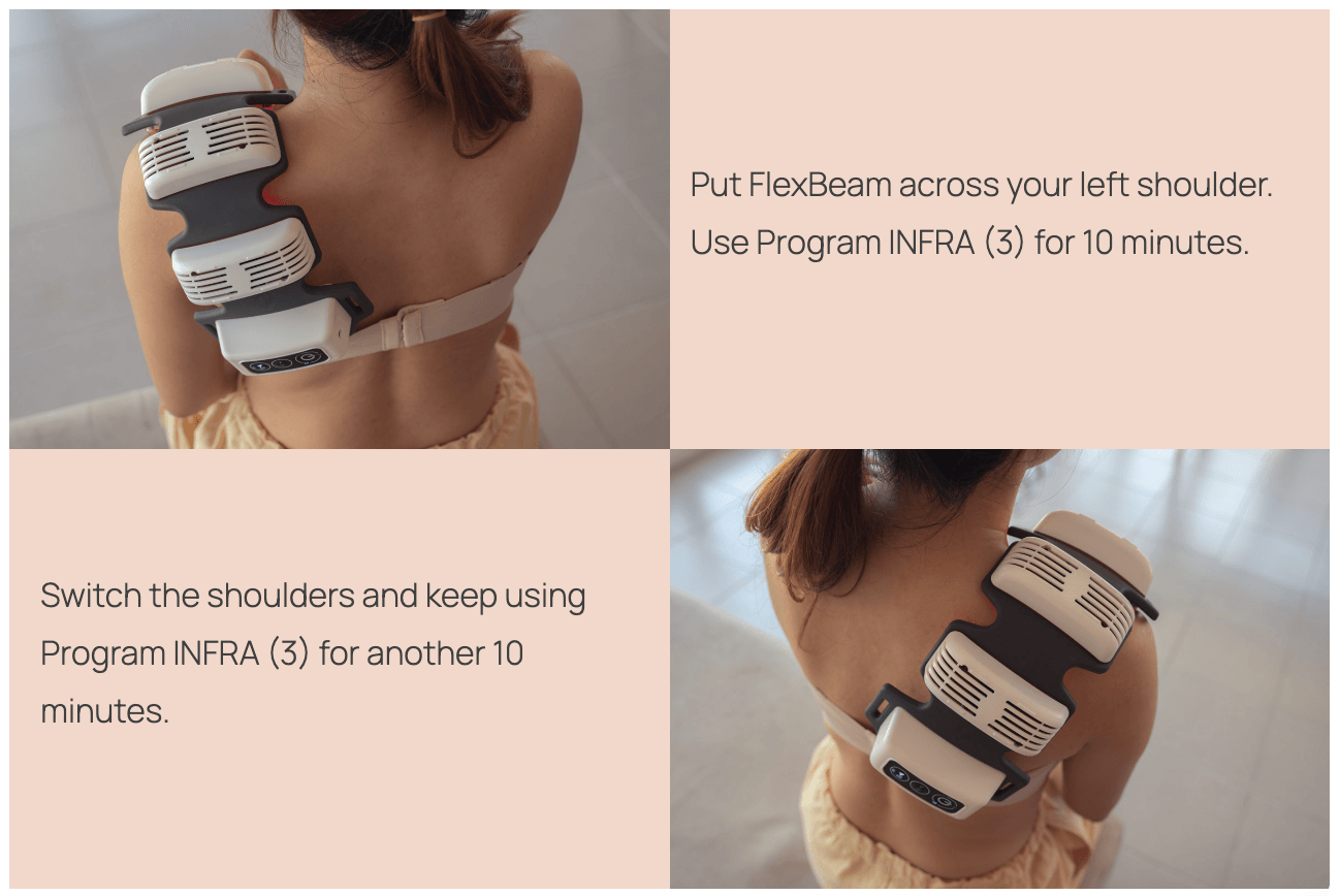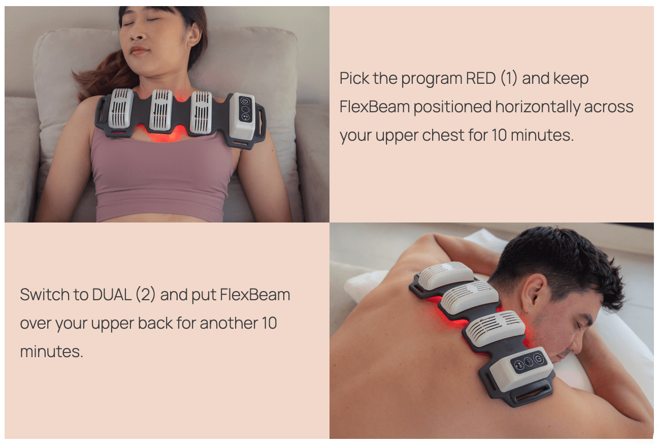 - Plassering 2: Bytt til DUAL (2) og plasser FlexBeam vannrett over øvre del av ryggen i 10 minutter.