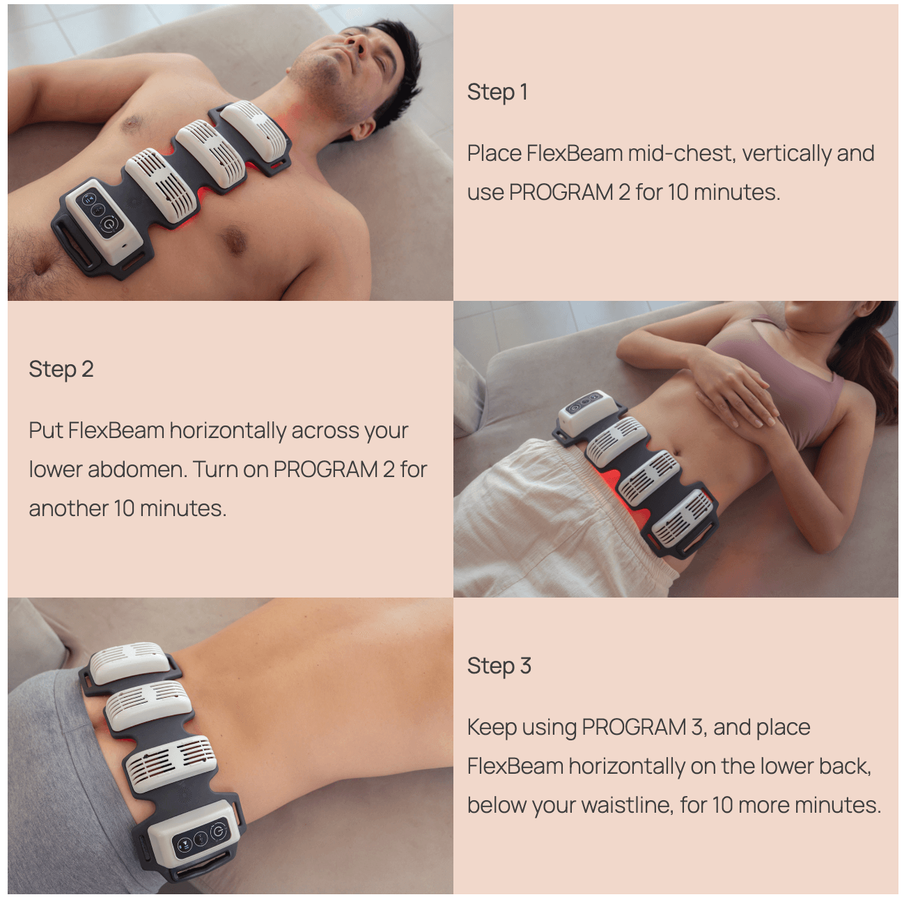 FlexBeam kan hjelpe deg med å forbedre både søvnmønsteret og selve søvnkvaliteten. For best resultat bør du bruke FlexBeam én gang daglig før leggetid i fem dager på rad, etterfulgt av to dager pause. Gjenta dette i tre uker.