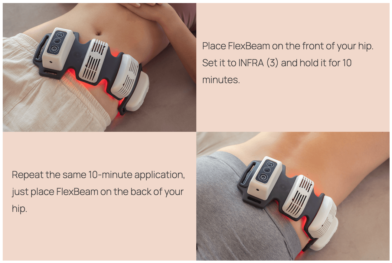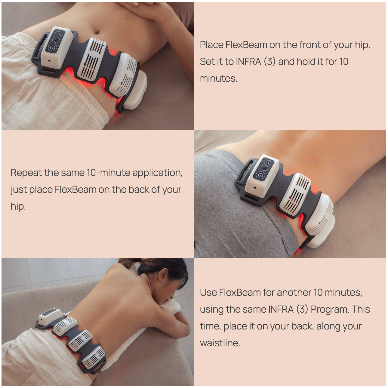 - Gjennomføring: Bruk programmet INFRA (3) i 10 minutter på hver side av hoften. Deretter legger du til 10 minutter med FlexBeam plassert på korsryggen.